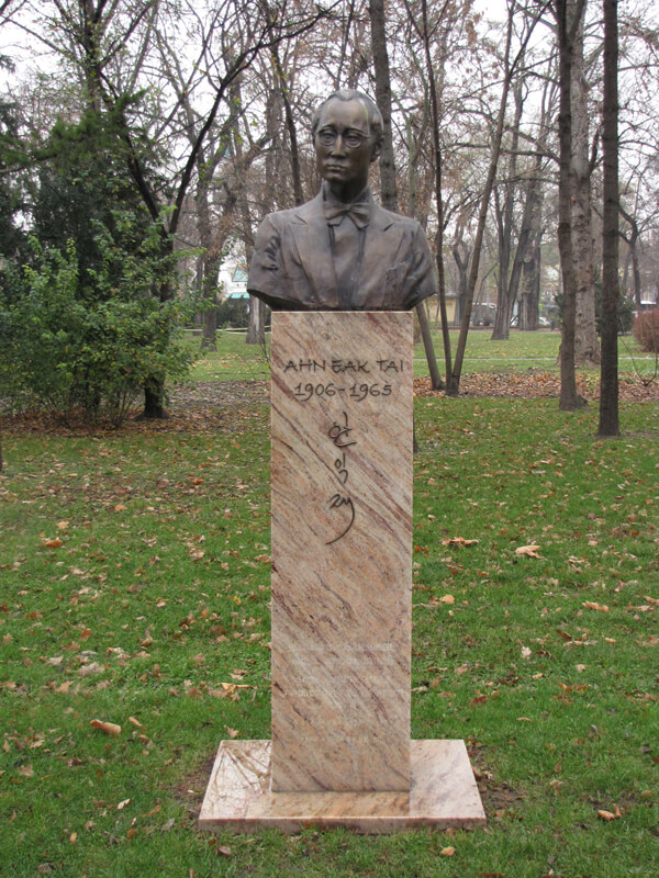 У питању је биста Ahn Eak-tai (1906-1965) корејског диригента и композитора који је дириговао многим оркестрима у Европи, укључујући бечки, берлински и римски филхармонијски оркестар. Такође је држао концерте у Будимпешти у којој је похађао Универзитет Етвеш Лоранд. Биста је свечано откривена 2012 године.