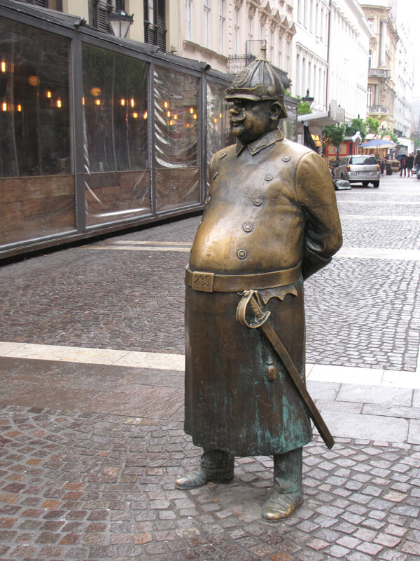 Друга скулпутра је полицајац-трбоња који стоји на раскрсници улица Október 6 и Zrínyi u. и „одржава ред“. Аутор скулптуре је признао да му је као прототип послужио сопствени деда који је у младости био хусар, који са годинама није пустио само бркове, већ и стомак. Постоји веровање да ће наредни оброк бити веома укусан ако се протрља полицајчев стомак, па је тај део тела баш фино изгланцан.