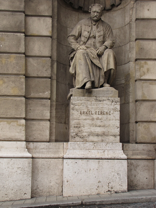 Крај улаза у зграду са десне стране налази се скулптура Франца Листа, а са леве Ференца Еркела (1810-1893), композитора мађарске химне и музичког директора опере. Обе скулптуре су дело вајара Алајоша Штробла.