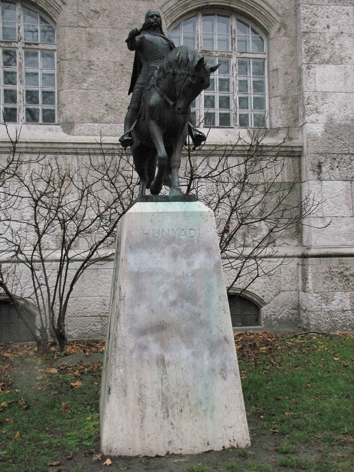 Испред дворца се налази споменик Јаношу Хуњадију. Споменик је постављен 1956., а рад је познатог мађарског вајара Пала Пацаја (мађ. Pál Pátzay). Јанош Хуњади приказан је на коњу и устремљеног погледа чиме је аутор желео да покаже сву његову моћ.