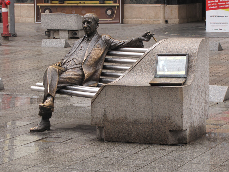 Познати мађарски композитор и аутор оперета приказан је како прекрстивши ноге седи на клупи, пуши цигару и посматра зграду оперете.