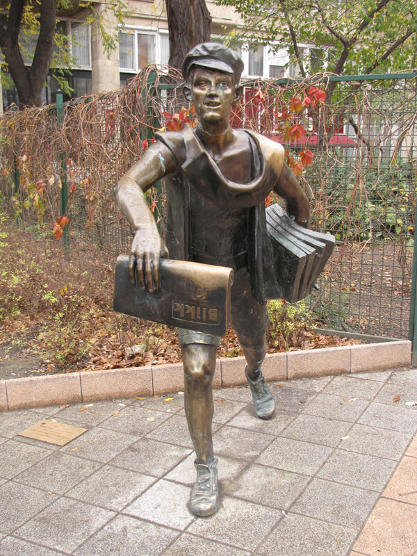 Прва од њих је скулптура дечака продавца новина (Rikkancs szobor). Скулптура је постављена 2012. на тргу „Hild tér“. Исте године њен аутор Лајош Секе напунио је 100 година. У десној руци дечак држи примерак таблоида „Блик“ кога није било у време када су се новине на овај начин продавале, па се постављало питање зашто није узет назив неких новина из тог периода. Аутор је на то одговорио да je на тим новинама инсистирао градоначелник, чије се име често налази на страницама управо тих новина.