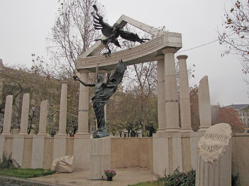 Историјска је чињеница да је Мађарска на почетку Другог светског рата склопила савез са Хитлером, јер је у томе видела могућност да поврати своје територије, изгубљене Тријанонским споразумом, док поменути споменик недвосмислено приказује Мађарску као жртву (бронзани орао који се устремио на архангела Гаврила који симболизује Мађарску). Од стране Немаца Мађарска бива окупирана тек у октобру 1944., након што је мађарски регент Миклош Хорти изразио спремност за потписивање примирја на почетку битке за Будимпешту.