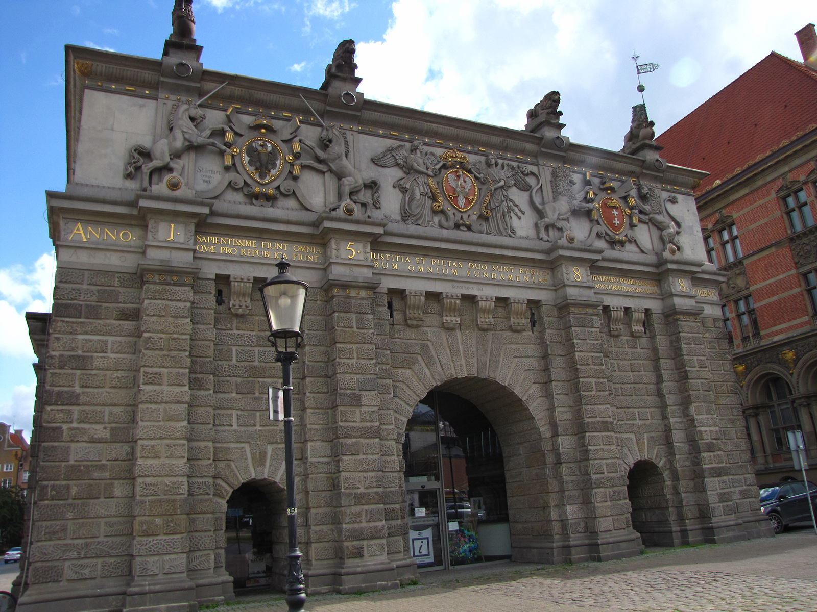 Капију красе грб Пољске (у средини), Гдањска (десно) и Прусије (лево), као и четири скулптуре лавова. Фасаду капије такође украшава неколико латинских изрека исписаних позлаћеним словима.